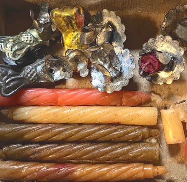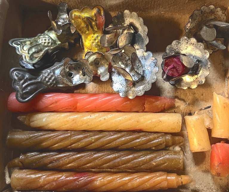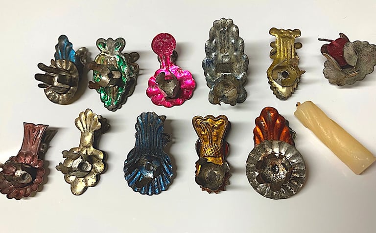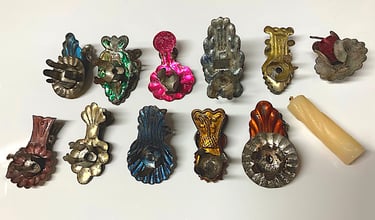 Tin candle-holders originated in Germany in the mid 19th century. They were used to hold wax candles and placed on feather trees at Christmas. The tin clip was patented in 1882. In 1879, the first spring clip design by Frederick Arzi was patented. Tin candle-holders were made in many patterns and either painted in bright colors or decorated with colored lacquer, a process called japaning. They remained popular through the 1920’s when the were eventually replaced by electric lights.