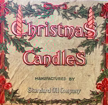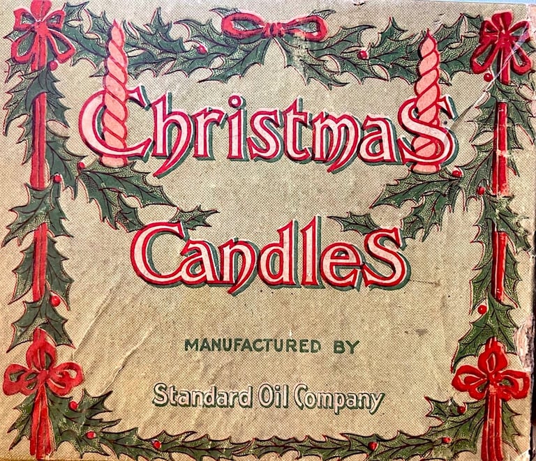 This past weekend my partner and I visited a local Flea Market. I made a great find, a 6”X3.5”X1” vintage Christmas box that once held 48 Christmas candles for tin candle- holders. They were manufactured by the Standard Oil Company in the 1920’s. The box was in very nice condition with lovely graphics in Christmas colors. The box did not contain its original contents but did contain 7 vintage candle-holders, some original candles both used and unused and a child’s tin play knife and spoon. I couldn’t wait to get home to my computer to research the history of my find. I have learned so much doing this.
